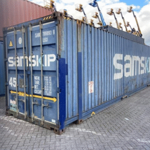 Le container 45 pieds High Cube d’occasion est idéal pour le transport maritime, le stockage et d’autres aménagements variés. Solide et conçu pour résister à des conditions d’utilisation exigeantes, il se distingue par sa structure en acier Corten, ses parois en tôle ondulée et ses longerons, garantissant ainsi une solution logistique fiable et durable.